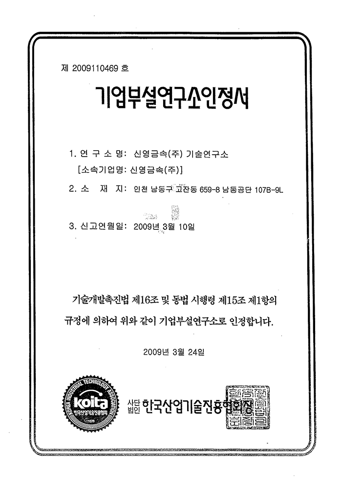 품질/기술 - 인증서 - 신영금속 - 인증서
